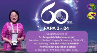Assistant Professor Dr.Rungpetch Sakulbumrungsil, President of the FAPA College of Pharmacy (FAPA-CP), receiving the FAPA Ishidate Award in The Pharmacy Education Section.